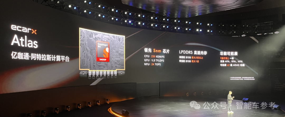 其中阿特拉斯平台使用车规级5nm芯片,CPU达到230KDMPIS,GPU算力1.3TFLOPS,NPU算力为24TOPS,内存容量和带宽均优于8155。