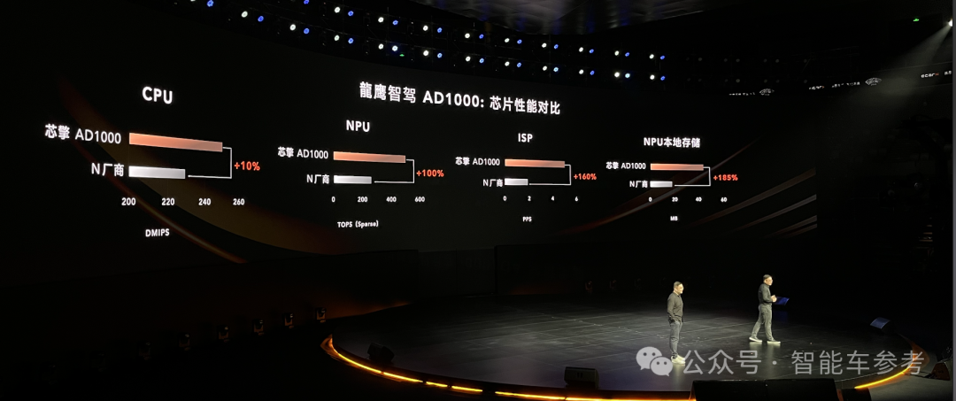 官方还拿来和国际某N开头厂商做个对比,(英伟达:直接报我身份证号得了),表示龍鹰智驾AD1000 CPU能力比N家产品高10%,NPU能力高100%,图像信号处理(ISP)能力高160%,NPU本地存储空间多185%,拥有更高性能。