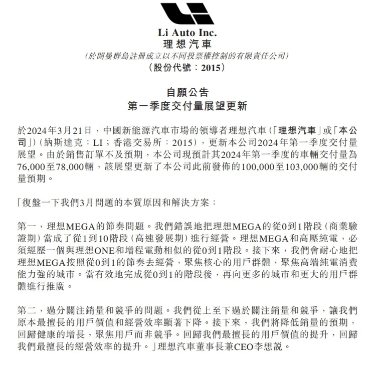 就在李想发布全员信后不久,理想汽车发布公告,由于销量不及预期,现将一季度预计交付量调整为7.6-7.8万辆。