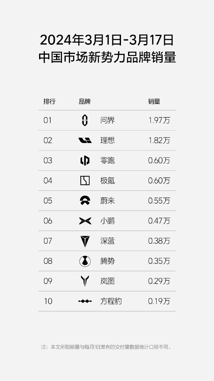 问界已经连续两个月夺下新势力销冠,截止本月17日,问界本月销量领先理想1500台,大概率问界会继续蝉联新势力销冠。