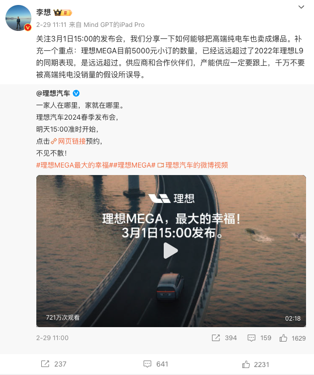 李想在信中表示,MEGA自身的问题还影响到了L系列,销售团队接待L系列用户的时间精力变少了,还挤占了L8的店面位置。