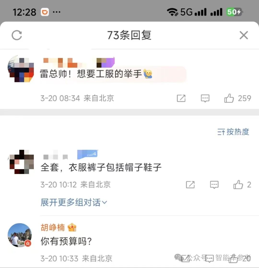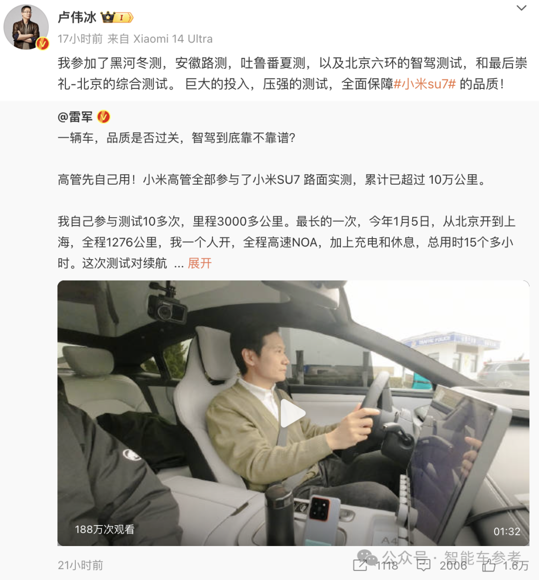 雷军发表微博后,小米集团总裁卢伟冰、小米公关总经理王化和顾问胡峥楠先后发声,表示参与了SU7测试。