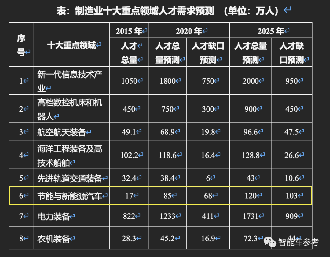 根据工信部发布的《制造业人才发展规划指南》,到2025年,节能与新能源汽车的人才总量预计达到120万人,但人才缺口预计达到103万人。其中,新能源汽车维修领域将面临80%的人才空白。