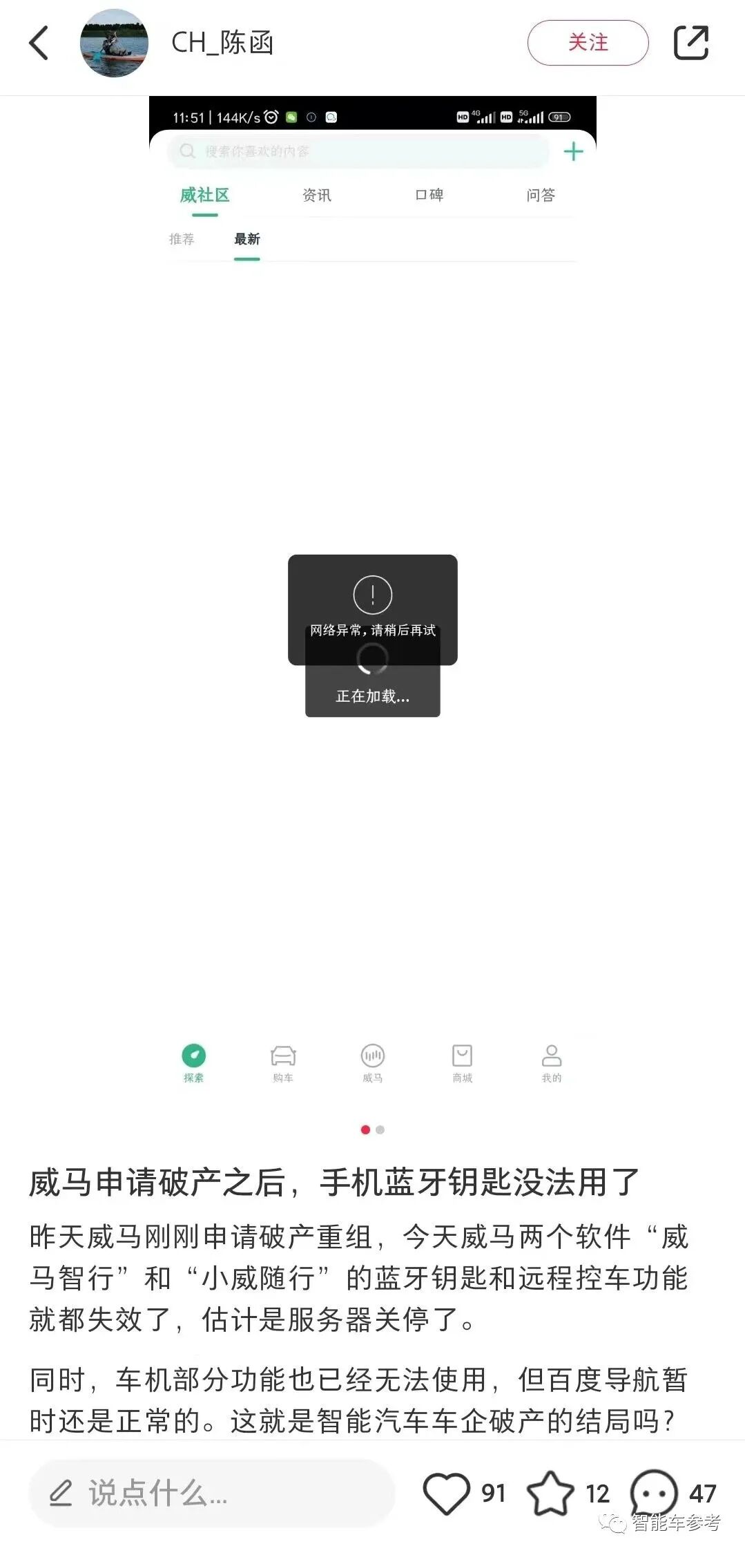 就在曝出威马进入破产重整的消息当天,小红书博主@CH_陈函在网上表示威马的两个软件,威马智行和小威随行,上面的蓝牙车钥匙和远程车控功能都失效了。