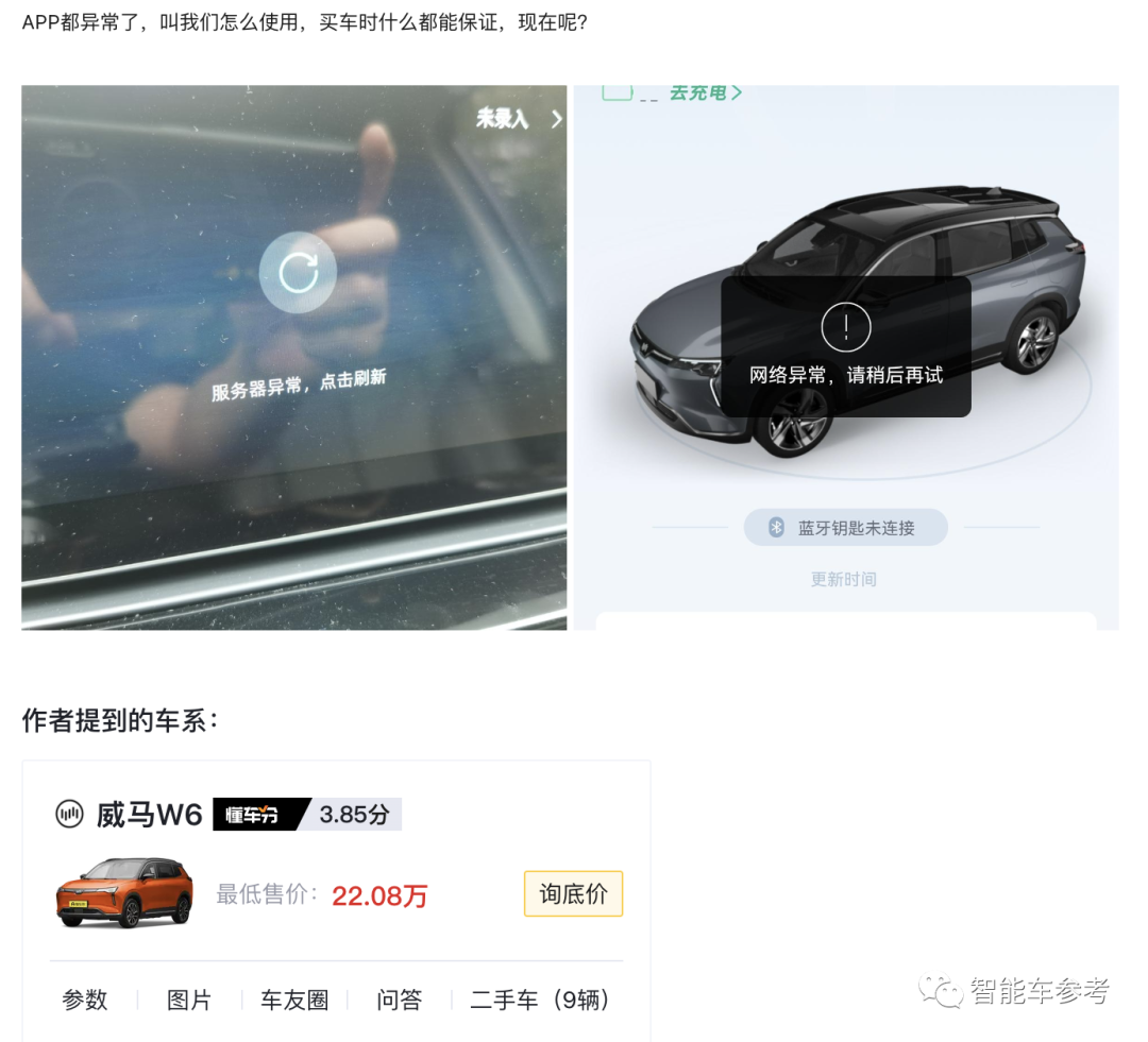 实际上,在上个月甚至更早之前,就有威马E.5、W6等车主发现APP异常、蓝牙连接不上,车机显示服务器异常等情况。