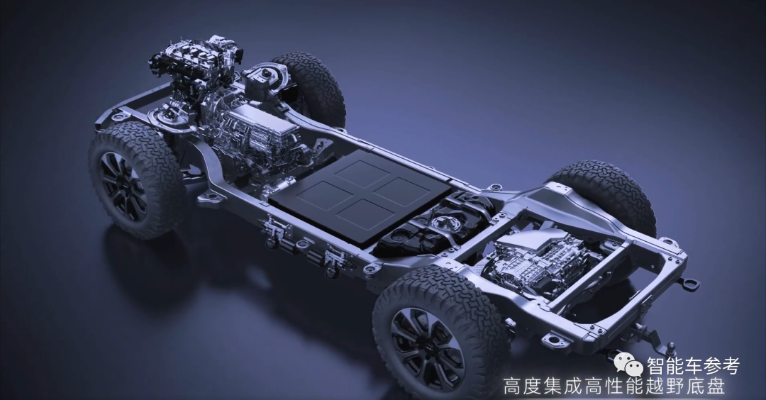 长城坦克的混动新能源越野,则是保留变速箱、分动箱、传动轴,采用P2并联结构,让动力无论何时都要先通过分动箱再传递给前后轴。