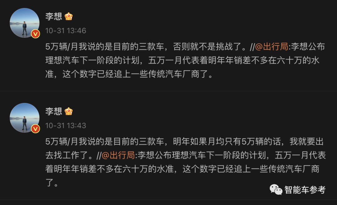 度过稳步增长的第三季度,李想给第四季度定下了5万辆的月销目标,同时还放狠话:“明年如果月均只有5万辆的话,我就要出去找工作了。”(不过后来删掉了这句话