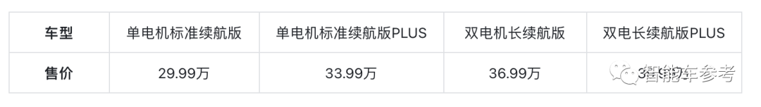 如此组合下来就是4款车型,单电机、单电机PLUS,双电机和双电机PLUS,售价29.99万-39.99万。