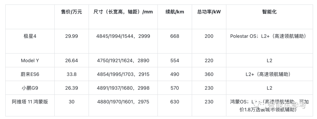 目前这个赛道,相比卷疯了的20万级,对手并不算多。除了Model Y,还有蔚来、小鹏G9、阿维塔 11等几款车型,主要参数对比如图。