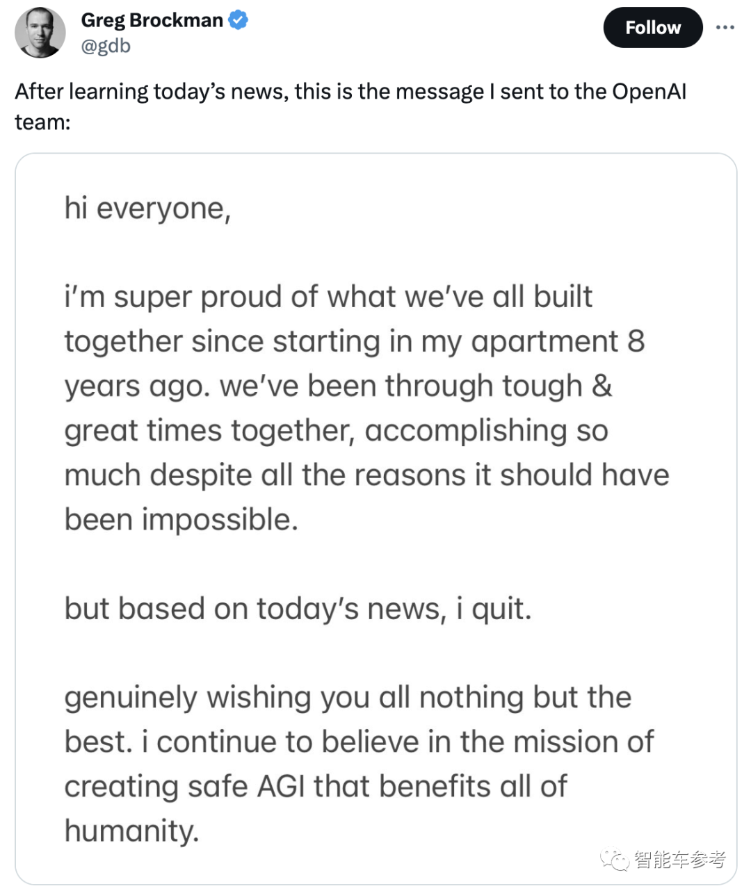 并且不仅奥特曼离职,同为OpenAI的高层,公司总裁兼联创Greg Brockman(格雷格·布罗克曼)随后也出面,直接在推特上写了一份辞职信:既然奥特曼被开除,我也不干了。