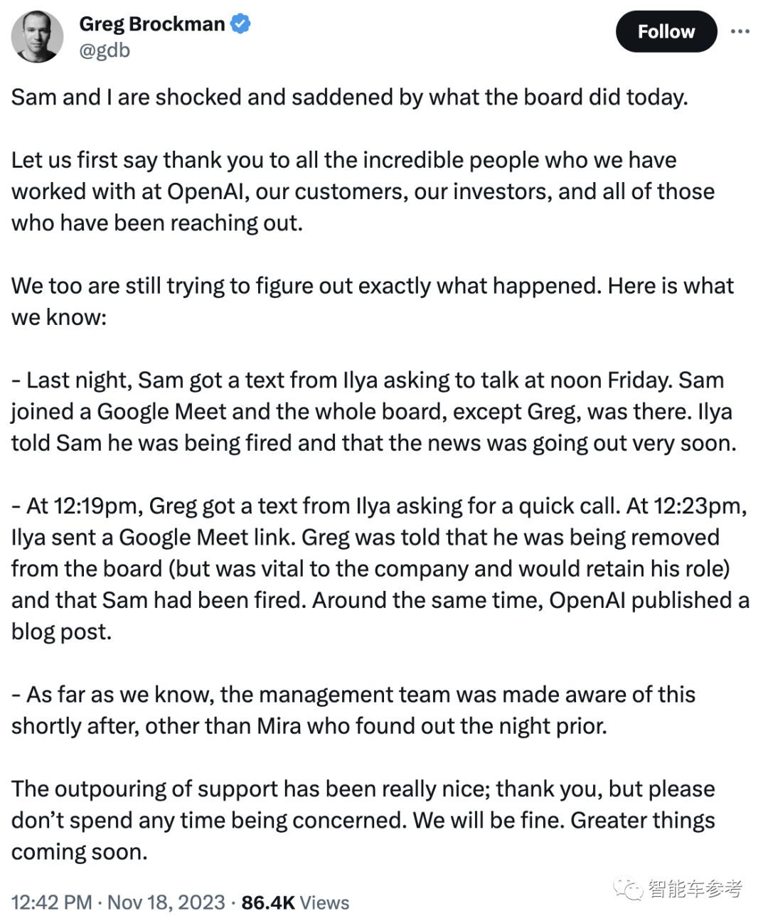 第二天,伊尔亚找格雷格开会,通知他将在董事会中被除名,但由于他对于公司很重要,所以将保留他总裁的职位。与此同时,OpenAI发布了奥特曼被解雇的公告。