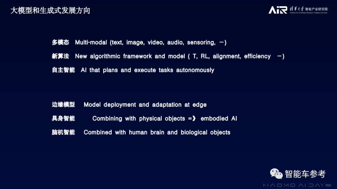 大模型走向了新方向。首先是多模态,不仅仅是自然语言、图像、视频,也包括传感信号、激光雷达等从所有车机发出的物理感知、生物感知信号。大家看到GPT-4大模型就是多模态的,其功能很强大,不过效率很低,大致比人大脑的计算和决策效率至少要低1000倍,所以还需要有新的算法,我觉得5年之后就会有新的算法出现。