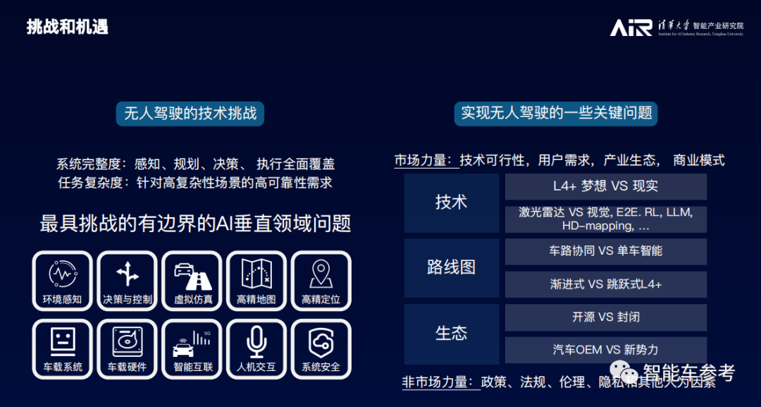 自动驾驶达到最后的安全、可靠阶段一定是端到端方式实现的,这个也非常难,这里面有更详细的技术因素,包括生成式AI、强化学习、大语言模型。