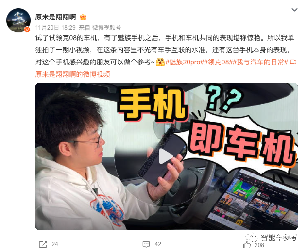 而在收购魅族一年多后,魅族车机在不久前首次上车了领克08,收获了大V和网友的好评: