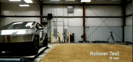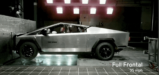 马斯克还展示了一些极限情况下Cybertruck的表现,比如近60公里(35英里)时速下正面碰撞,驾驶舱无侵入,A柱无变形: