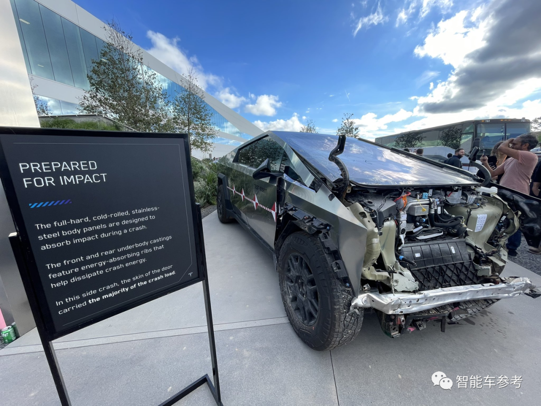 “战损版赛博皮卡“看起来应该是经过了撞击测试,可以明显看到车头损坏比较严重,挡风玻璃也出现了裂痕,但侧车身相对损坏较轻。