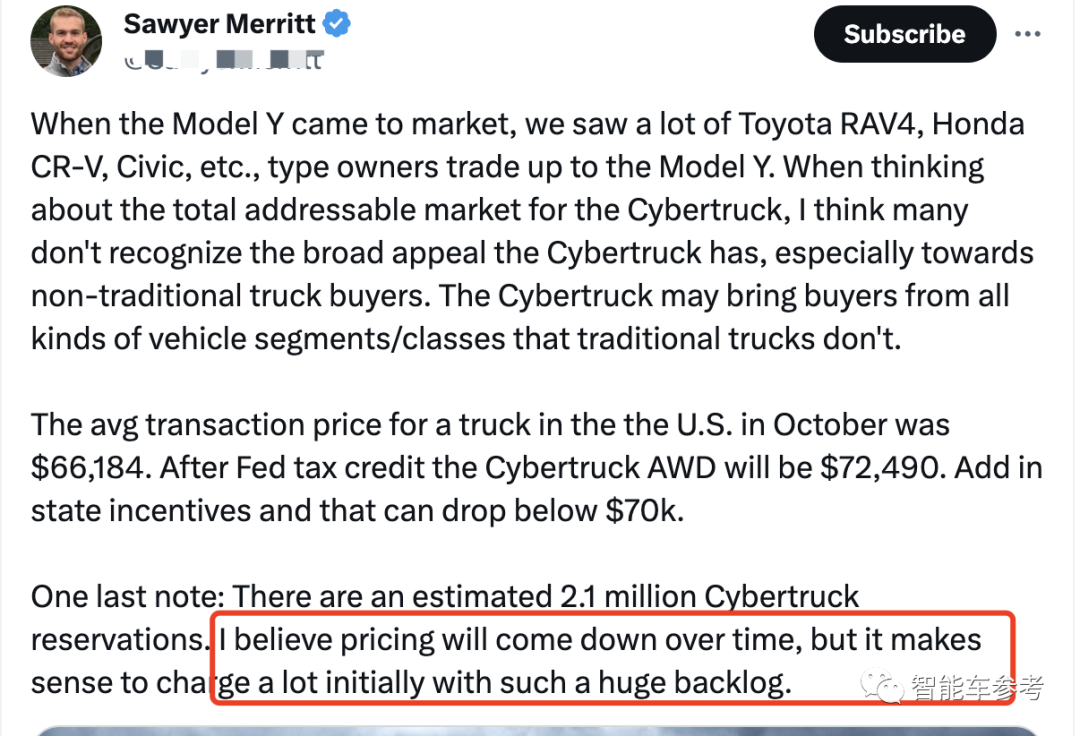 国外知名社区Reddit联合创始人奥哈尼安表示,赛博皮卡大但是并不笨重,开起来体验甚至比他的Model X还好。