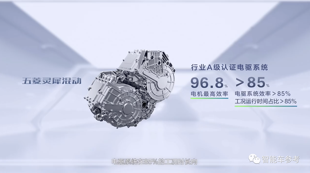 系统还包括最高效率96.8%的电机,最大功率130kW,最大扭矩320N·m,前置前驱;以及首创电磁式混动专用变速箱,五菱介绍这款变速箱响应速度要比液压式DHT快4倍。
