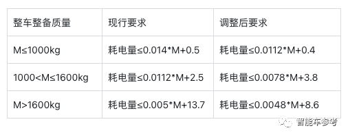 另外一个大的调整是能耗,不过现有车辆基本可以满足(耗电量为百公里耗电量,M代表汽车自身重量)。