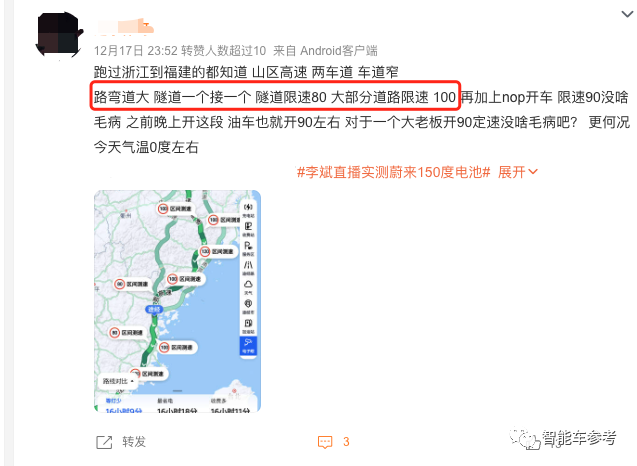 李斌坦承,如果时速保持在110km/h,续航最终会在900km上下,自己还在做直播,保持这一时速也有安全考虑。