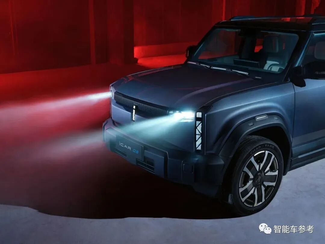 iCAR 03外观非常方方正正,官方介绍这是“方盒设计美学”,车头灯组设计还融入品牌logo字母“i”,带6种智能灯语,对应开关锁、打招呼、寻车等功能。