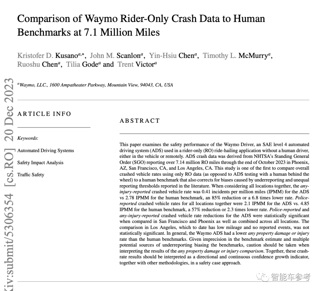 除了这篇论文,Waymo还发布了一篇详细对比Waymo Robotaxi和人类司机事故碰撞率的论文,其实翻来覆去就是想说明一件事:自动驾驶技术真的比人类司机更安全。