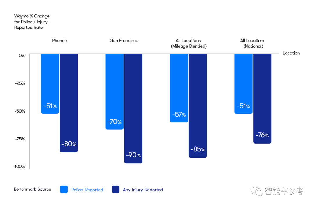 而在排除这些影响因素后,Waymo得出的结论是,Waymo Robotaxi在凤凰城能降低80%的伤害事故发生概率,在旧金山能降低90%。(洛杉矶累计行程比较短,Waymo认为还不具有统计意义上的价值。)