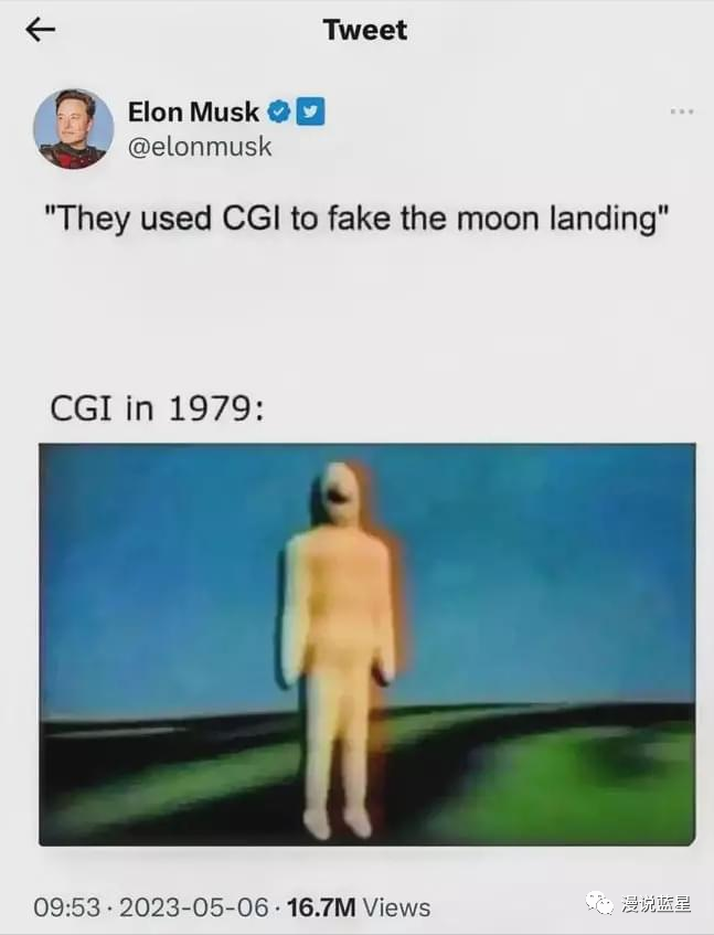 实际上,关于美国登月造假这件事,历来就伴随着广泛的质疑和争论声。今年五月份的时候,特斯拉的掌门人埃隆马斯克曾经发了一条推文,再次引发了美国登月造假一说的讨论。马斯克的这条推文的内容非常简单,就一句话,他们当年用电脑模拟了登月,并附上了一张上世纪的CGI技术图片。