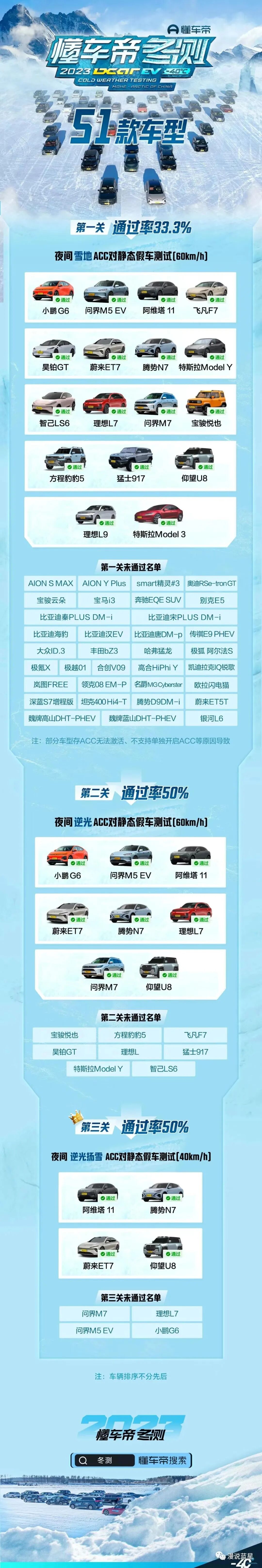 2023年的最后一个月中,懂车帝在漠河进行“夜间雪地ACC争夺战”的成绩引发热议。夜间雪地ACC测试,就是在道路中间摆放静态假车,并且车辆开启自适应巡航系统和自动紧急制动功能下,看车辆能不能完成制动。最终,比亚迪腾势N7和仰望U8成功闯关,成为最大赢家。