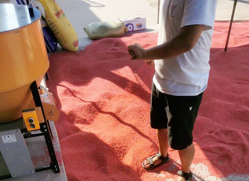 人工拌种的方法很简单,地面上放塑料布,把小麦种植倒在塑料布上,拌种剂加水稀释后,均匀地倒在小麦种子上,随后不断翻动,让每一粒小麦种子,都能沾到拌种剂药液,拌种完毕后,摊开晾干后,即可播种,一般以种植面积较小的农户为主。优点是随时可以拌种,缺点是相对麻烦一些。