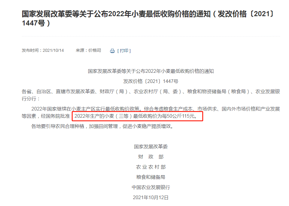 10月14日,国家发展改革委、农业农村部等多个部门,发布了关于2022年小麦最低收购价格的通知,通知中明确了2022年小麦最低收购价格,每斤1.15元,和2021年相比,每斤上涨了0.02元。