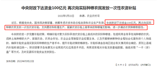 一则“中央财政下达资金100亿元再次向实际种粮农民发放一次性农资补贴”的消息,再一次成为了农民朋友热议的话题。据悉,此次的100亿元农资补贴,主要考虑农资市场价格走势和农业生产形势而定的,目的是支持夏收和秋播生产,缓解农资价格上涨带来的种粮增支影响,进一步调动农民种粮积极性。