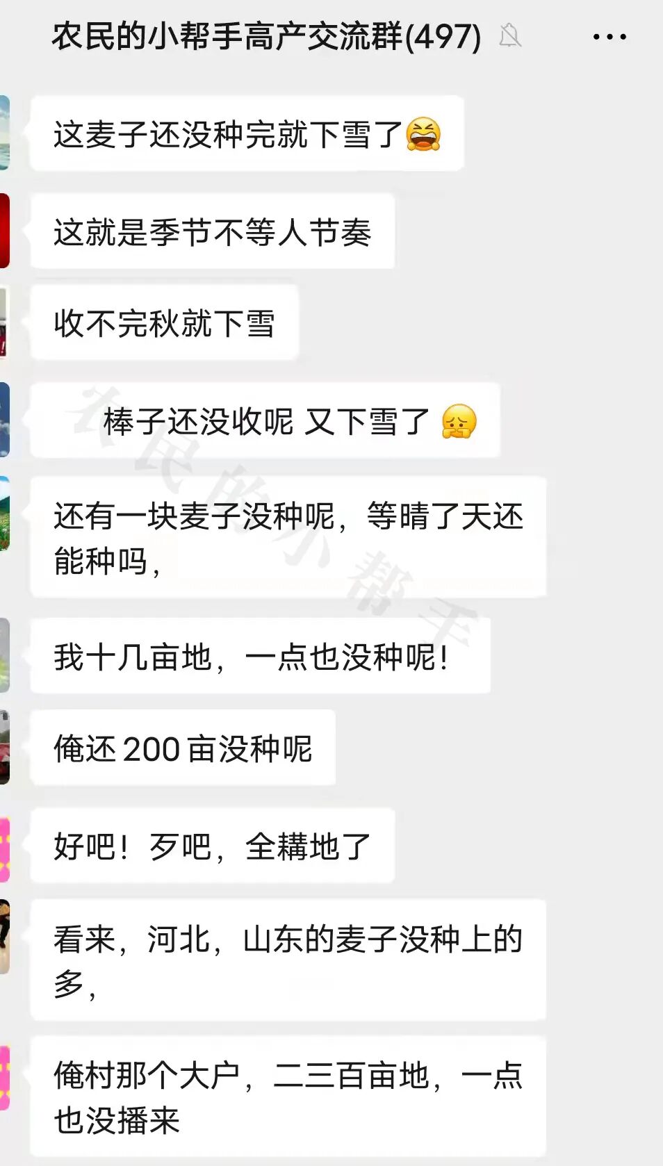 突如其来的一场大雪,打乱了农户们种植的节奏,在小帮手高产交流群,群友们讨论了这样一个问题:小麦还未种就下雪了,有些十几亩,有些上百亩,今年还能播种吗?播种之后会不会出苗?查看地区,群友们主要来自山东聊城、山东德州、山西长治、河北邢台、河南新乡,包含地区还是挺多的。