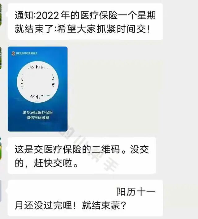 我们村的群里面,村委会的相关人员,突然发出了一条通知,2022年的城乡居民医疗保险还有一个星期就结束了,希望大家抓紧时间交!看到此通知后,我首先想到的是结束时间这么早,不是应该到2021年12月31截止吗?群里的其他村民也有类似的疑惑,11月还没过完,怎么就要结束了?提前截止了吗?
