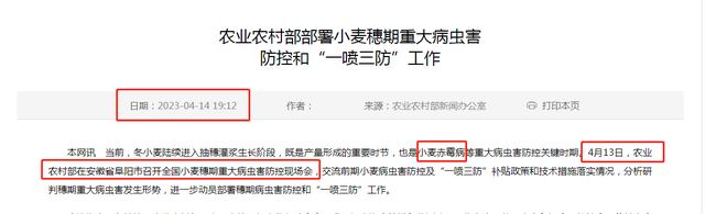 4月23日,又发布了黄淮海等冬小麦主产区对于赤霉病的防控工作,落实“一喷三防”工作。