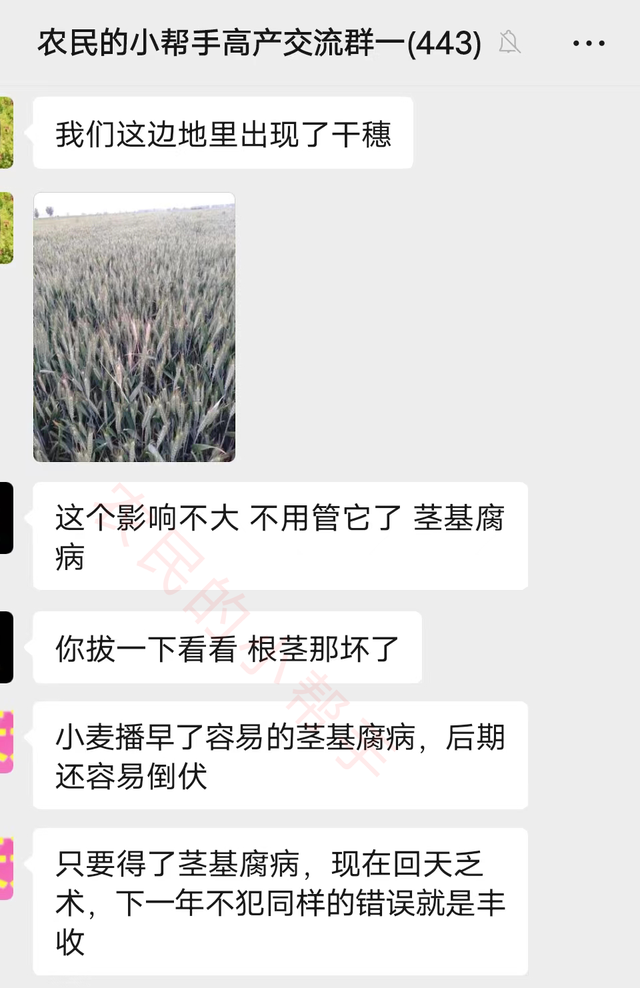 在小帮手高产交流群,一位来自河南的群友就遇到了小麦白穗现象,而另外一位同样来自河南的群友说,自己也遇到了类似情况,可以把白穗的麦株拔出来,查看根茎部位,会发现已经坏了,原因就是由于茎基腐病所导致。