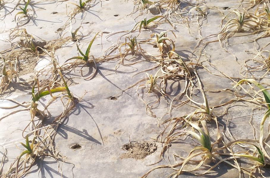 具体表现为上部叶片受害较重,产生黄白色病斑,沿叶缘、叶尖向内扩展,叶片呈黄白色。根据受冻害的严重程度,影响后续抽薹以及鳞茎后期的生长。