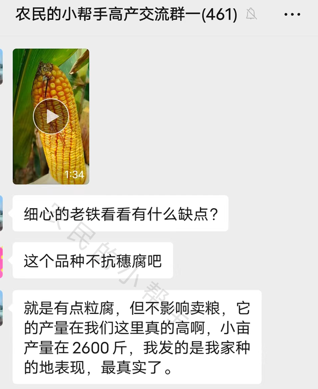 在小帮手高产交流群,群友们在讨论哪些玉米品种好的话题,有一位群友说,今年他们当地有一个玉米品种,亩产能达到2600斤(30水分湿粮重量),但是有点粒腐病,不影响卖粮。