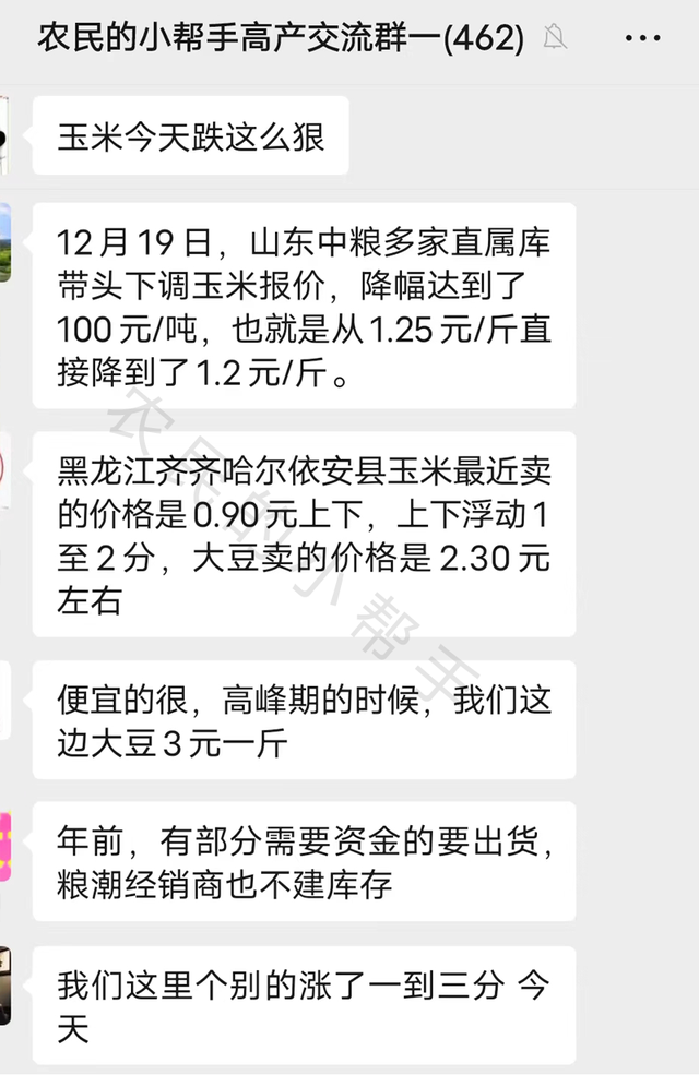在小帮手高产交流群,近期大家讨论玉米价格比较多,有来自黑龙江齐齐哈尔的群友说,他们当地的基层玉米价格已跌到了0.90元/斤上下,今年新粮玉米价格再创新低。而来自河南、河北、山东的不少群友,也说当地的玉米价格是天天跌,已经跌到了1.10元/斤附近。