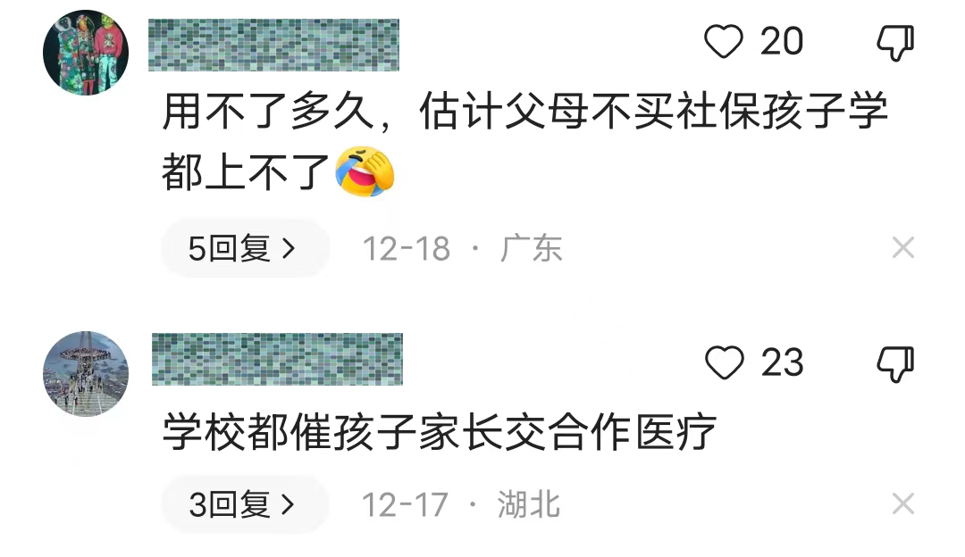 其中,把影响小孩上学当条件的网友相对多一些,家长们为了不耽误,也只能进行缴费。一些家长对此行为也不理解,为何医保和教育牵扯到了一块。