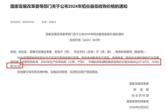2024年3月刚开始,国家发展改革委、财政部、农业农村部、国家粮食和储备局就联合发布了2024年稻谷最低收购价的通知。