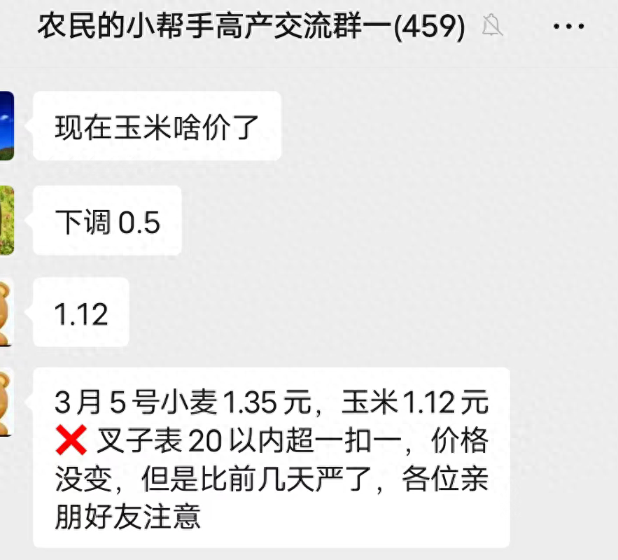 来自山东德州的群友说,他们当地最新玉米价格为1.12元/斤,而河南周口的最新玉米价格为1.15元/斤,河北邢台的群友说,他们当地最新玉米价格为1.14元/斤。