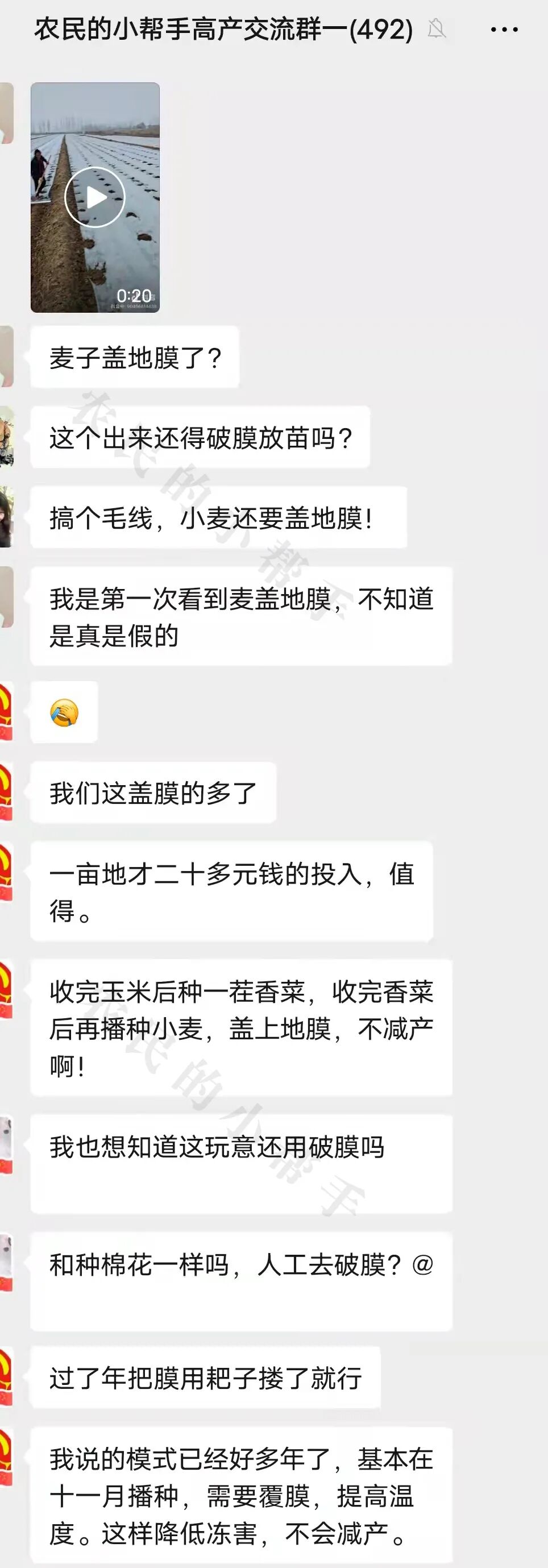 在小帮手高产交流群,群友们对于小麦是不是要盖地膜的事情,进行了详细的讨论。起因是一位群友发了一个视频,视频的内容是农户们正在给小麦覆盖地膜。而群友们讨论的内容,也从小麦要不要覆盖地膜,以及后续如何覆盖地膜等,展开了一定的讨论学习。摘取了部分内容,具体如下: