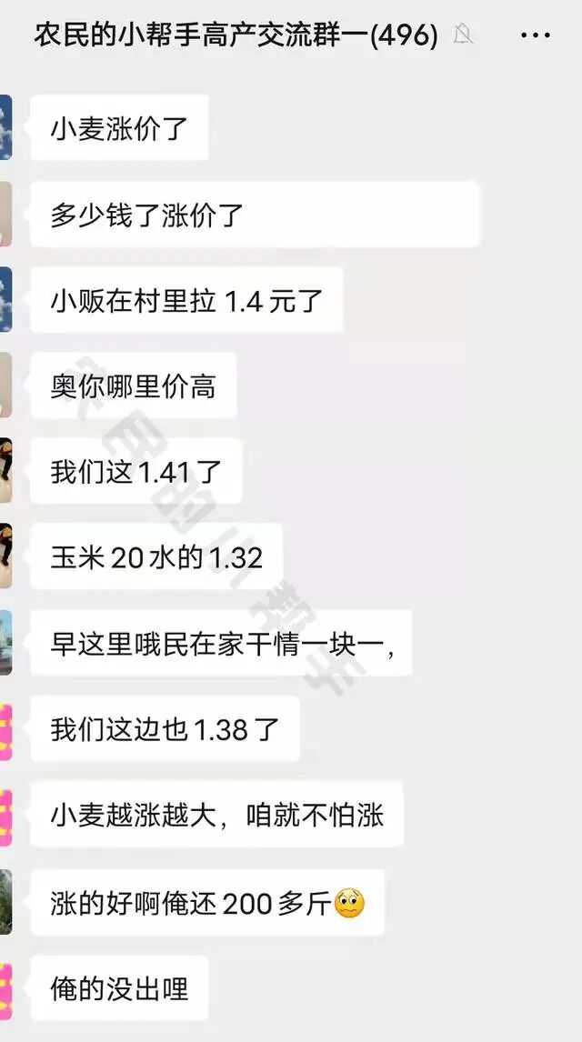 小麦涨价了!每斤涨到1.40元以上了。在小帮手高产交流群,群友们讨论了小麦价格的问题,来自河北邢台的群友说,他们当地小贩在村里的收购价格都达到了1.40元/斤,河南周口的群友说,他们当地已经1.41元了。当然,山东德州的群友说,他们那里的小麦价格也1.38元/斤了。