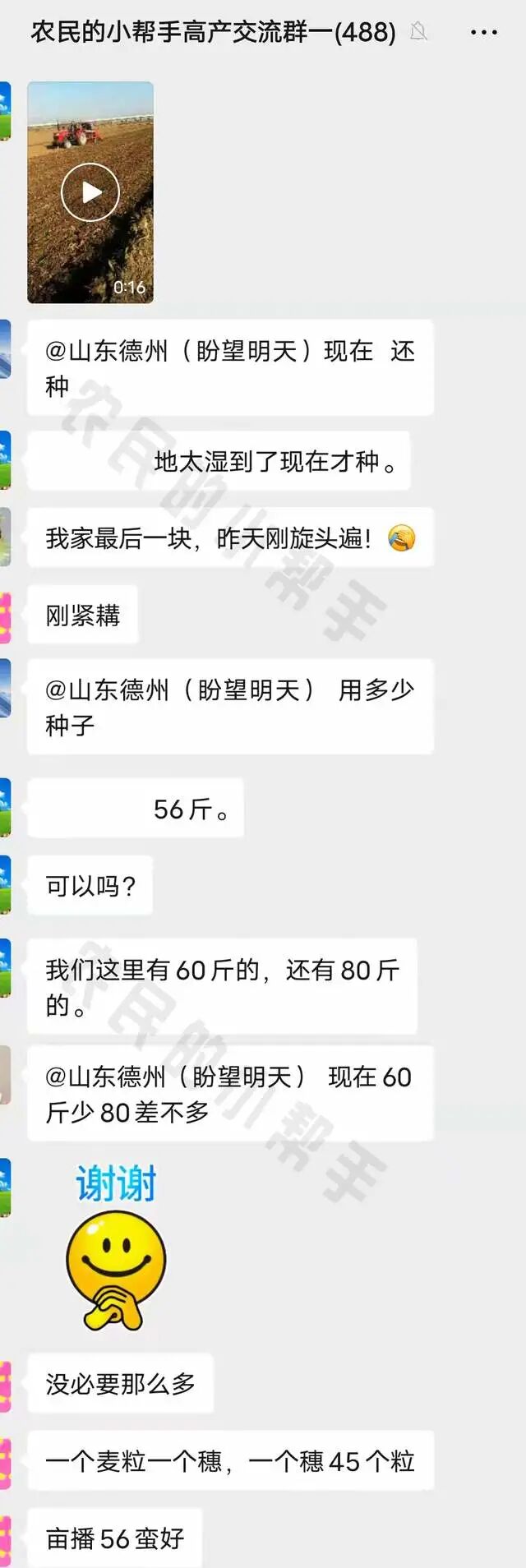 在小帮手高产交流群,就有山东德州的群友发布了一段小麦播种的视频,视频是他自己拍的,播种的是他家自己的小麦,播种时间12月4日。看到这段视频后,群里的另外一位德州的群友说,他家的小麦,还有最后一块地,刚旋地一遍,还没开始播种。