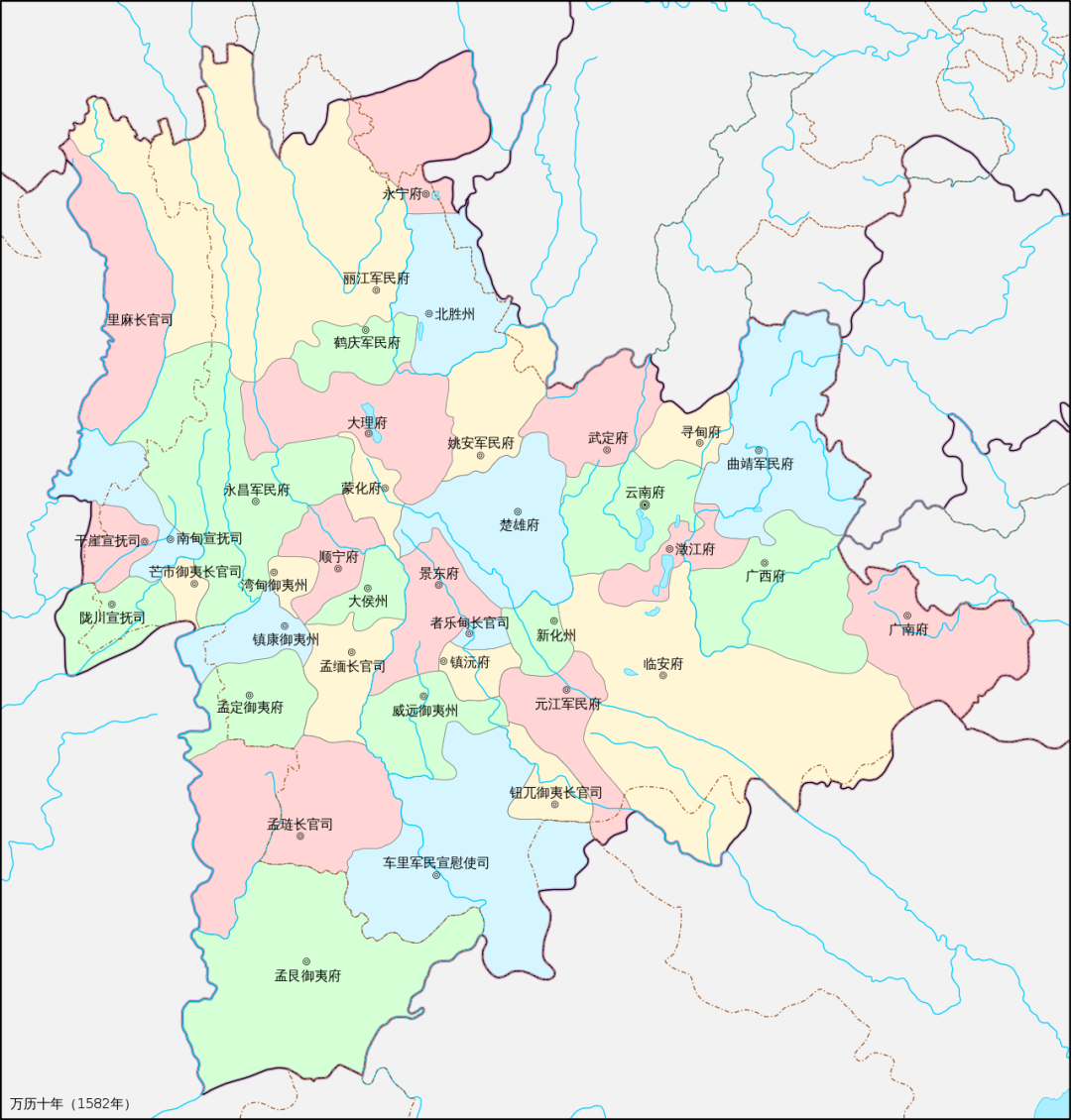 明朝对云南的治理体系进一步完善,15至16世纪,云南的鹤庆白族土府、寻甸、广西、武定彝族土府、顺宁布朗族土府相继改土归流,纳入明朝中央政府管辖。