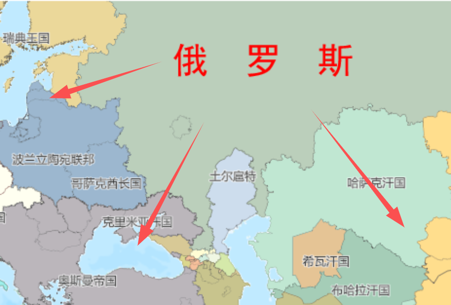 最重要的变化还是来自东欧,在向东占领了西伯利亚后,俄罗斯的野心逐渐膨胀,准备建立一个超级大国。于是,它将主要的扩张方向转向了中欧和中亚。