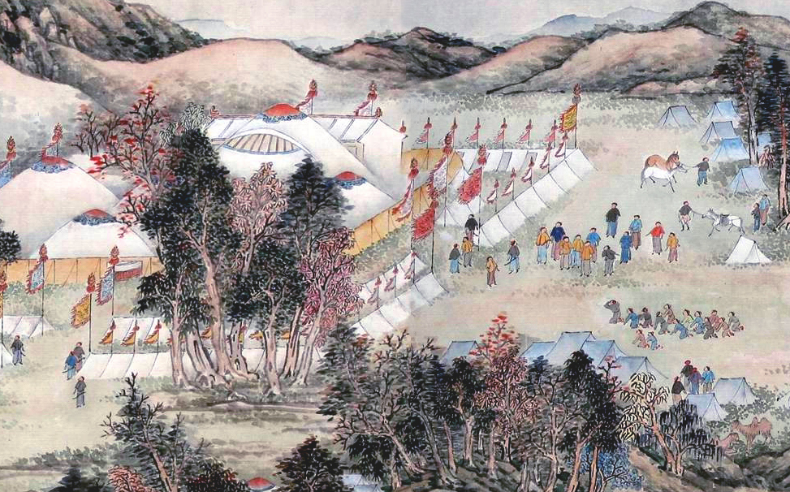▲清·《土尔扈特归顺图》(局部)描绘了乾隆皇帝在避暑山庄接见土尔扈特部的场景