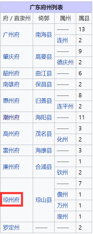 ▲明朝广东各府州列表,琼州府即今天的海南省