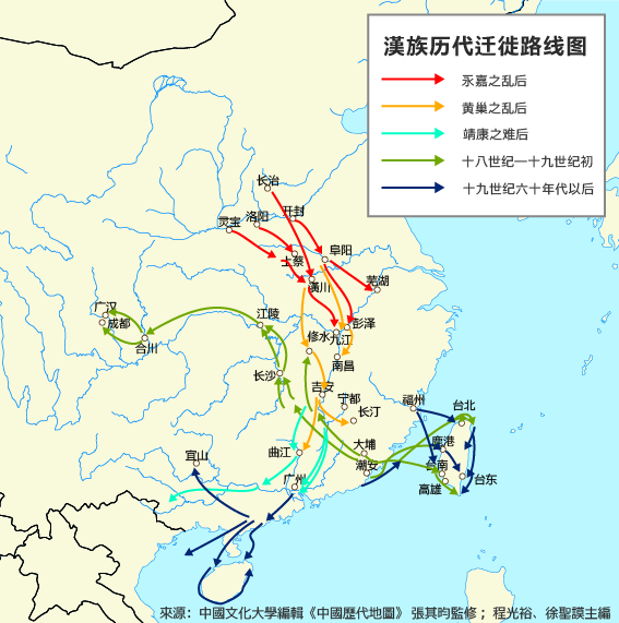 ▲汉族历代迁徙。唐黄巢之乱后,福建成重要人口迁入地;宋靖康之难后,福建人又向两广海南迁徙